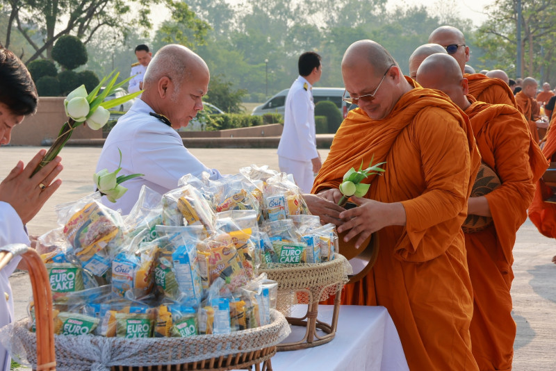 จากนั้น ได้ร่วมกันทำบุญตักบาตร ข้าวสาร อาหารแห้ง แด่พระภิกษุสงฆ์ ณ บริเวณลานปิยมิตร เพื่อแสดงออก